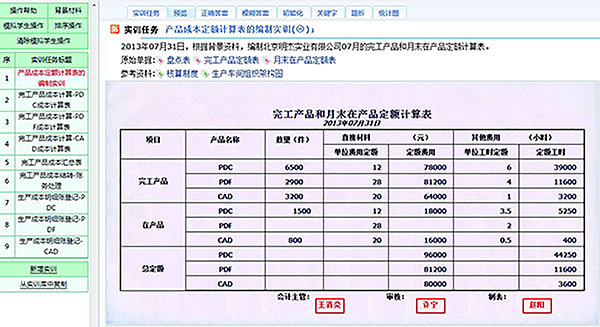 计算量大与大量的图表运用是成本会计课程的一大特点。产品成本的构成涉及料、工、费等多个项目,因其承担的对象不同而有不同的归集、分配和结转程序,其间需要繁多的数据处理。我司研发的成本会计实训教学平台软件,依成本会计核算实务的实际操作流程及成本核算方法进行设计,成本会计实训内容囊括费用要素的归集、分配,辅助生产费用和制造费用的归集、分配,生产费用在完工产品和在产品之间的分配,产品成本计算的基本方法和辅助方法,成本报表的编制与分析,及成本管理与控制等。该平台能够很好地处理表单计算结果、记账凭证和账簿结转的对应关系,重点强化训练学生填制原始凭证、编制记账凭证、入账及成本核算的能力。