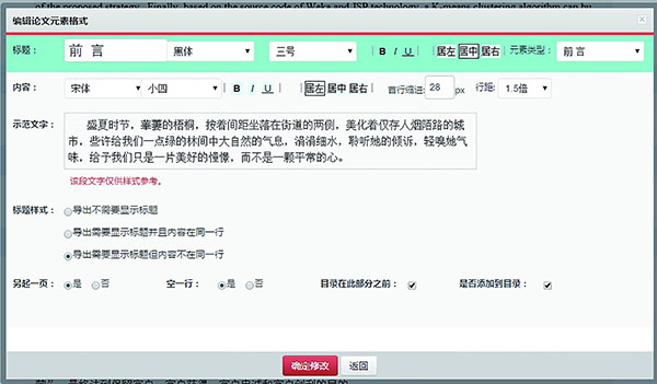 规范化:可设置论文各部分的格式规范:如字体、字体的大小、行间距、是否在新的一页生成、该部分是否添加到目录索引中、设置目